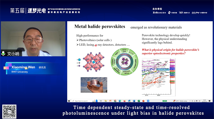 遠在澳大利亞皇家墨爾本理工大學的文小明研究員通過國際直播平臺,為國內外科研工作者做Time dependent steady-state and time-resolved photoluminescence under light bias in halide perovskites英文報告,文老師首先介紹了穩(wěn)態(tài)光致發(fā)光 (PL) 和時間分辨光致發(fā)光 (TRPL) 技術發(fā)展現(xiàn)狀。然而,當對表現(xiàn)出光照誘導的 PL 光譜、效率和壽命變化的材料(如鹵化物鈣鈦礦)進行測量時,這些技術面臨一些問題。在過去十年中,鹵化物鈣鈦礦因其優(yōu)異的光電特性和出色的器件性能(如高效太陽能電池、光電探測器和 LED)而引起了極大的研究興趣。使用標準 PL/TRPL 測量時,可能會忽略和遺漏關鍵信息,并可能導致誤解。本次報告文老師重點介紹一些光照誘導 PL 效率和載流子壽命增加的應用案例。使用專門設計的時間相關 PL/TRPL,有/沒有光照偏置,進行探索異常的光電特性,并利用其團隊*近提出的晶格能量庫理論對該現(xiàn)象做了很好地解釋。文老師作為卓立漢光產(chǎn)品的使用者,也在演講中感謝卓立漢光的協(xié)助,其團隊在RIMT大學定制了多功能PL-TRPL光譜系統(tǒng),該系統(tǒng)能夠完成上述大部分功能,并且功能大大擴展,包括激發(fā)、檢測范圍??梢灶A期該系統(tǒng)將能為其團隊的光物理研究提供重要的技術支持。