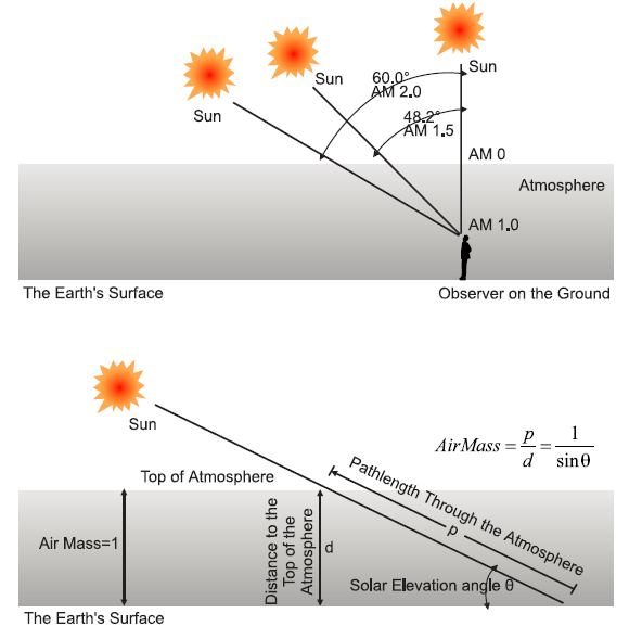 在地面上任何地方都不能排除大氣吸收對太陽輻射的影響,因此引入大氣質(zhì)量(air mass,AM)的概念。
