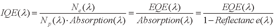 光子電子換轉(zhuǎn)效率,即入射單色光子- 電子轉(zhuǎn)換效率,定義為單位時間內(nèi)外電路中產(chǎn)生的電子數(shù)與入射的單色光子數(shù)之比。IPCE 的概念更多用在光電化學(xué)類器件上,在定義上與EQE 是類似的。