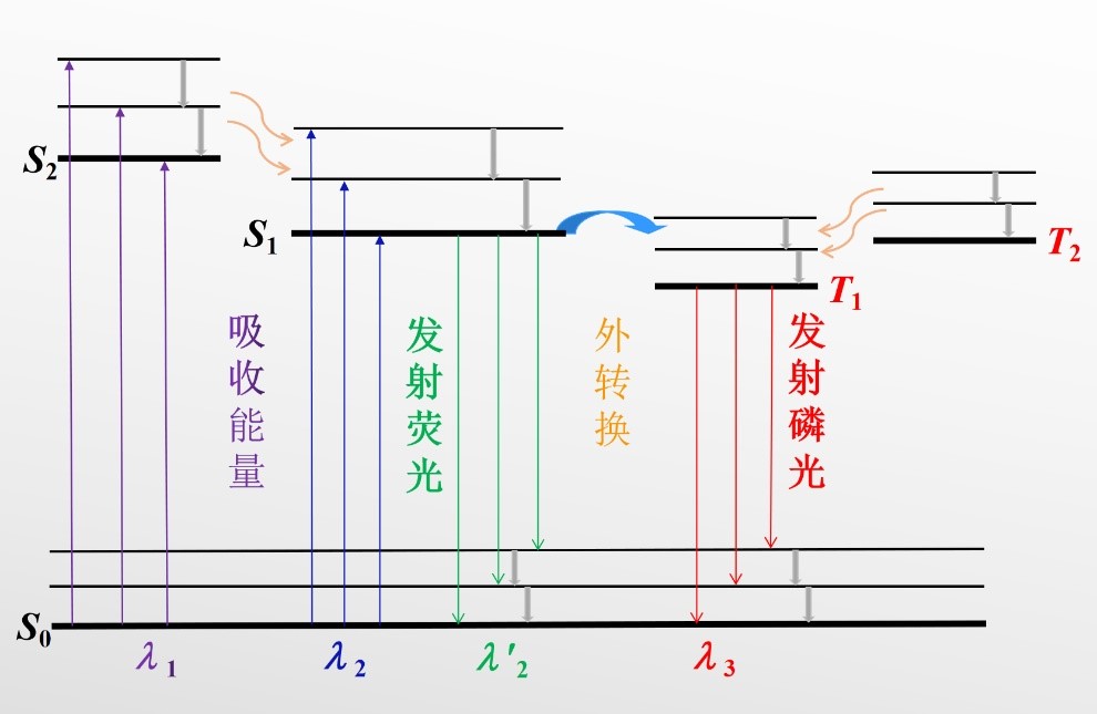 其本質(zhì)是物質(zhì)分子吸收了激發(fā)光的能量,短波長(zhǎng)的激發(fā)光使其周?chē)碾娮佑苫鶓B(tài)躍遷到能量更高的第一激發(fā)態(tài),或是第二激發(fā)態(tài)。在激發(fā)態(tài)的電子非常不穩(wěn)定,它們會(huì)以多種不同的形式釋放能量,從而回到基態(tài),這是一個(gè)很復(fù)雜的過(guò)程。