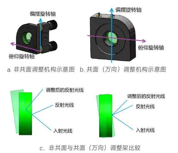 調(diào)整俯仰、偏擺的結(jié)構(gòu),通常分為兩種 :一種稱為非共面調(diào)整,另一種稱為共面調(diào)整(或萬向調(diào)整)。