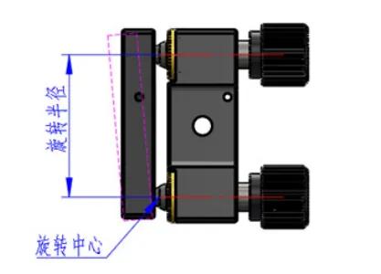 光學(xué)調(diào)整架的非共面調(diào)整機(jī)構(gòu)中,繞俯仰、偏擺的轉(zhuǎn)軸相交在一個角上(通常是鋼球所在的位置),由鋼球和一套螺紋副,構(gòu)成一個轉(zhuǎn)動軸,調(diào)整另一套螺紋副時(shí),相當(dāng)于調(diào)整架的前面板(活動板)繞此軸轉(zhuǎn)動(參見圖6a)。