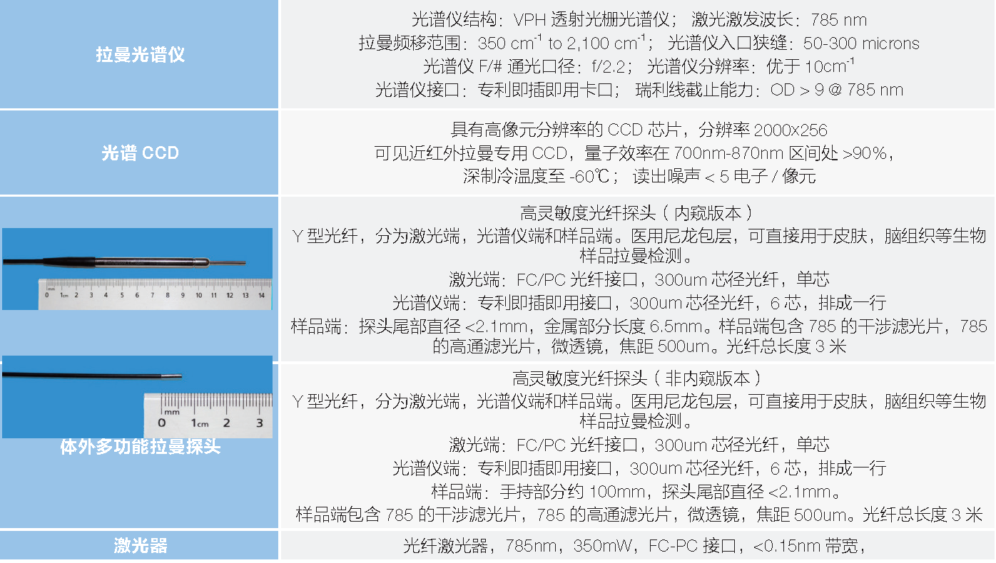 系統(tǒng)采用醫(yī)用專用拉曼探頭,廣泛適用于各種高靈敏需求,如消化道檢測(cè)、開顱手術(shù)腦腫瘤檢測(cè),采用醫(yī)用尼龍光纖包層和不銹鋼探頭封裝, 除常規(guī)的2.1mm內(nèi)窺鏡探頭外,可定制1.65,0.9mm 超細(xì)探頭,用于動(dòng)脈血栓的檢測(cè)。