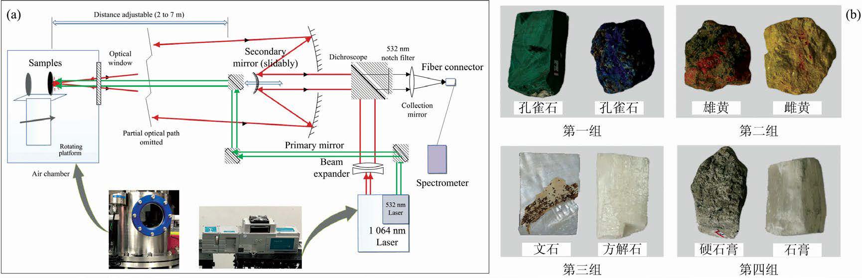行星探測中國科學(xué)院萬雄老師設(shè)計了一款激光誘導(dǎo)擊穿光譜LIBS+ 拉曼系統(tǒng)在火星模擬環(huán)境下礦物樣品的綜合檢測能力,采用卡塞格林望遠(yuǎn)鏡結(jié)構(gòu),遠(yuǎn)程脈沖拉曼光譜激發(fā),成功檢測了8 種典型礦物質(zhì)(孔雀石、藍(lán)銅礦、雄黃、文石、方解石、硬石膏和石膏等),實驗結(jié)果表明,該系統(tǒng)可以在火星條件下有效分析礦物種類和成分。