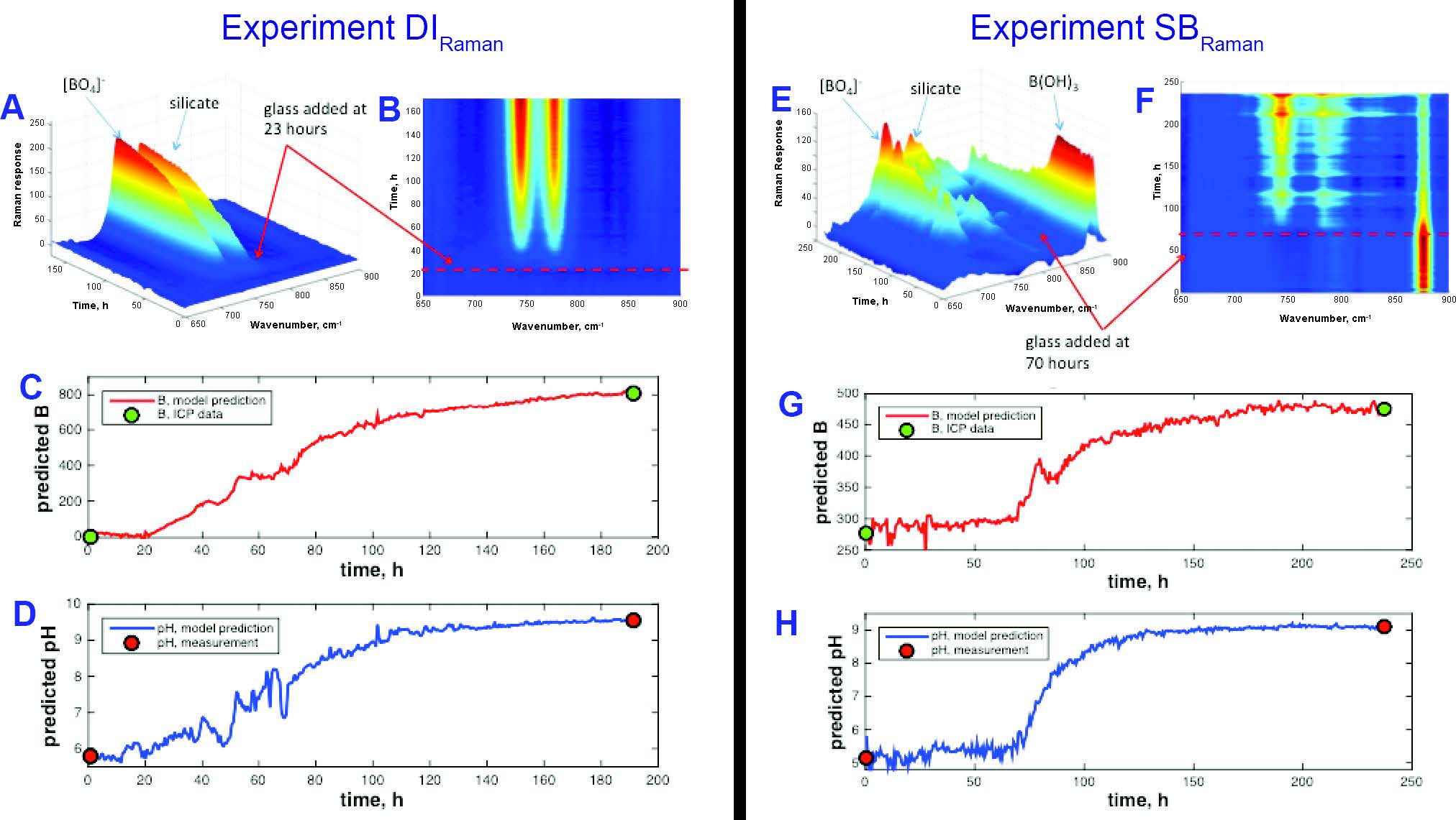 圖 拉曼光譜模型圖,DI(超純水溶劑,A-D)SB(加硼酸鹽溶劑,E-H),A,B,E,F 是拉曼光譜與時間三維圖;