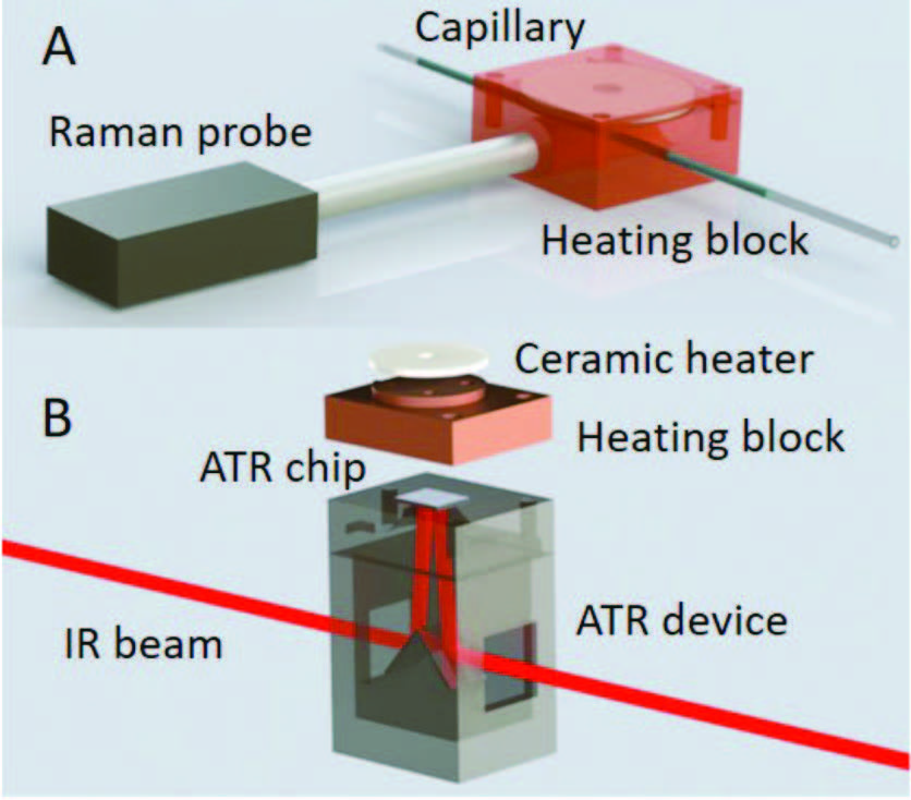 Lu W [3] 等人應(yīng)用光纖拉曼原位監(jiān)測微芯片反應(yīng)器中金屬- 有機(jī)物Co-MOF-74 生長過程,實驗時FIR 和WAVS 提供物質(zhì)的原子坐標(biāo)和晶格信息,拉曼和MIR 提供分子結(jié)構(gòu)信息并獲得成核生長曲線。