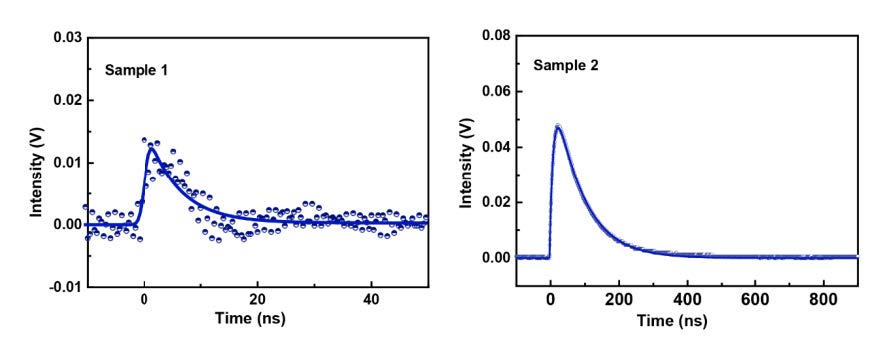 上圖為使用ps 激光器測試的不同類型的探測器的瞬態(tài)光電流曲線,點線是實測曲線,實線為擬合曲線。樣品1 硅基探測器,