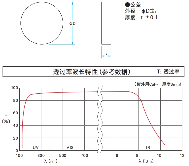 紫外·紅外用窗口沒有蒸鍍防反射膜。由于存在表面反射(每面3%)的損失,所以透過率約為94%。