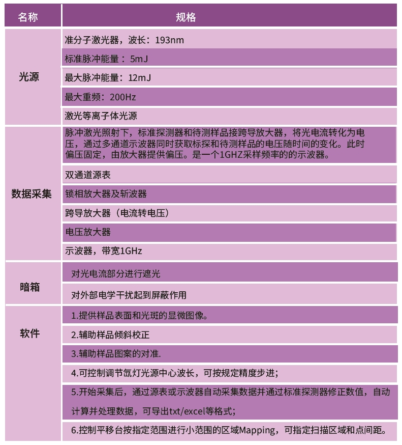 可通過物鏡切換轉(zhuǎn)輪,在聚焦和非聚集的兩種情況下測量:聚焦時,光斑通過紫外消色差透鏡組聚焦到0.5mm以下,Mapping小范圍,測量探測器的不均勻性;不聚焦時,物鏡轉(zhuǎn)輪切換到通孔,直接用高斯光束照射樣品,通過光闌控制高斯光束的束寬,根據(jù)輸入的版圖位置測量器件不同區(qū)域的響應(yīng)度。