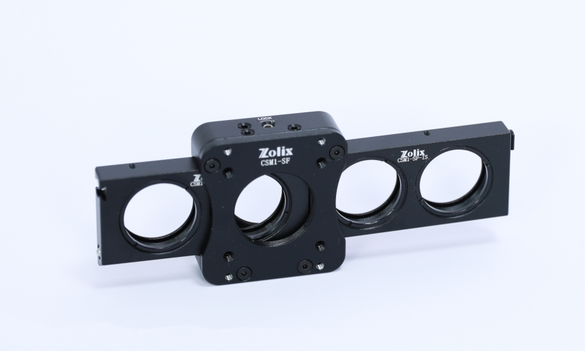 Zolix 提供的滑動(dòng)濾光片調(diào)整架 CSM1-SF 附帶兩個(gè) CSM1-SF-IS 插條,最多可安裝四個(gè) Ø25.4 mm 的光學(xué)元件,CSM1-SF-IS 插條可單獨(dú)購(gòu)買。插條與主體通過(guò)鋼球和 V 型槽加燕尾軌道進(jìn)行定位,頂部帶有鎖緊螺釘可在定位后將其鎖緊。底部帶有 M4 螺紋孔用于連接光學(xué)接桿。主體帶有 8 個(gè) M3 螺紋孔用于兼容 30 mm 籠式系統(tǒng)。蓋板上有 4 個(gè) M2.5 螺紋孔用于疊加安裝架。