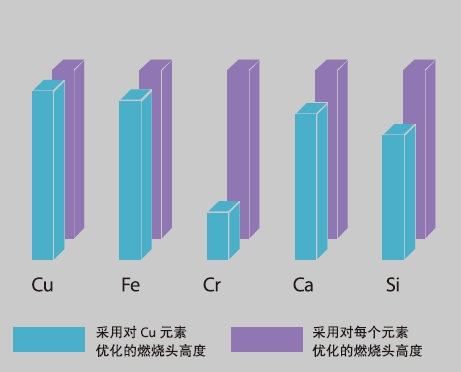 工作頭的位置,作為分析方法的一個(gè)參數(shù),與分析方法一起存儲(chǔ),這樣無(wú)需操作人員介入,即可保證多元素火焰分析的每一個(gè)元素都能得到*佳的靈敏度。下圖顯示的是對(duì)各個(gè)元素分別進(jìn)行燃燒頭高度優(yōu)化得到的靈敏度 ( 紫色 )和只對(duì) Cu 元素進(jìn)行優(yōu)化得到的靈敏度 ( 青色 ) 對(duì)比。