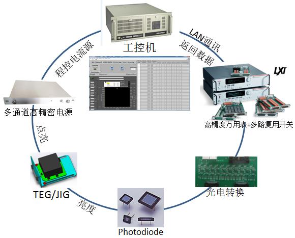 該系統(tǒng)是集成系統(tǒng)檢測軟件、多通道電源、硅光電二極管光電轉(zhuǎn)換、工控機(jī)為一體的自動化檢測系統(tǒng),主要應(yīng)用于OLED TEG/JIG加速老化壽命測試。