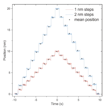 圖2:以 1 nm 和 2 nm 步 長 分 別 進 行 的 10 步 往 復(fù)測量。測量在距反射器 150 mm 處進行,光學(xué)傳 感器頭精確對準(zhǔn)反射器中心。測量帶寬為 50 Hz, 每一步的平均位置數(shù)據(jù)點均通過對該步內(nèi)所有單 獨數(shù)據(jù)點(共 1000 個)取平均值計算得到。