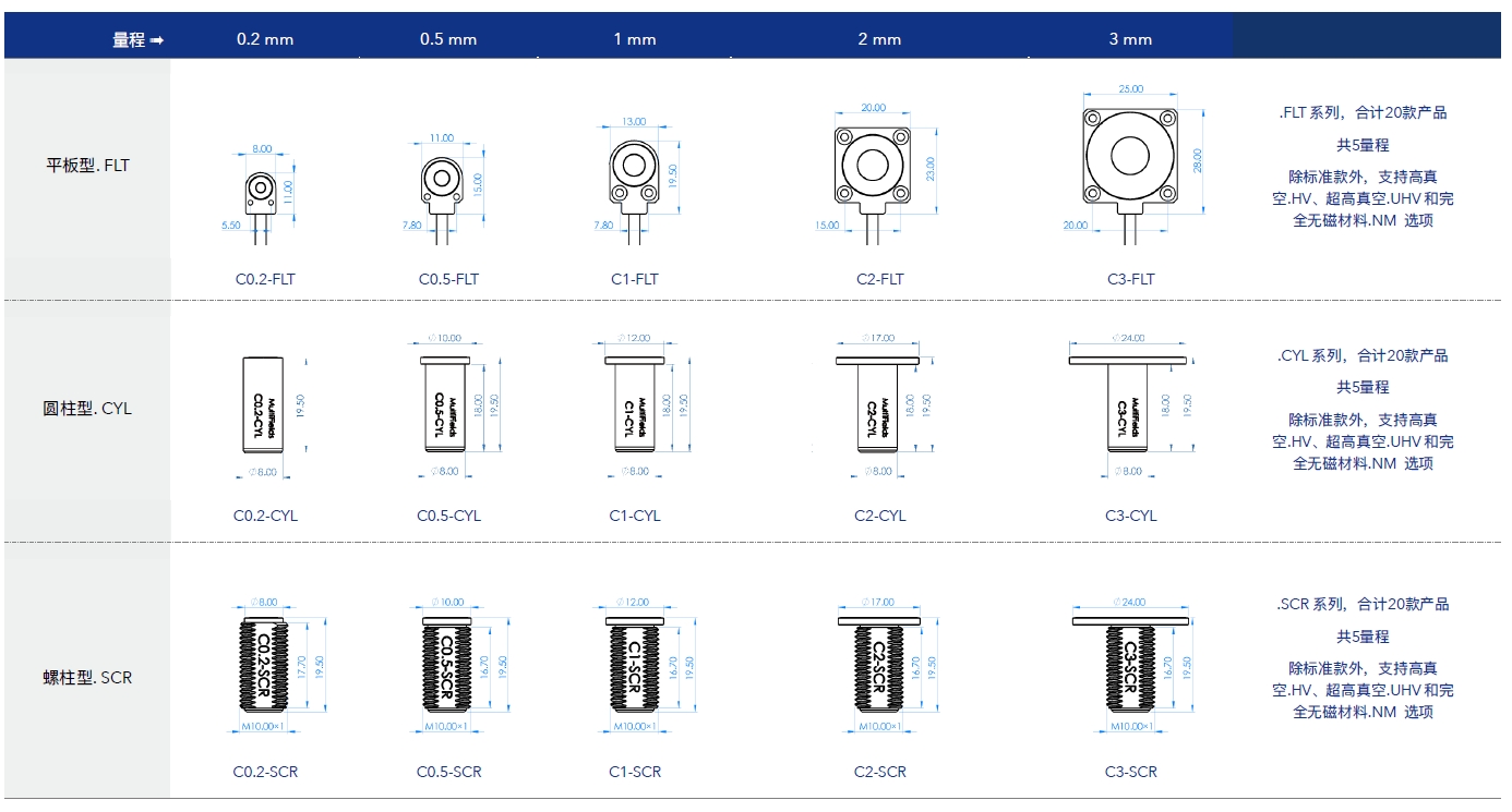 提供平板、圓柱和螺柱三種探頭形式,量程覆蓋范圍 0.2 mm, 0.5 mm, 1mm, 2mm & 3mm,并提供高真空.HV, 超高真空.UHV 和完全無(wú)磁材料.NM 的多版本選擇