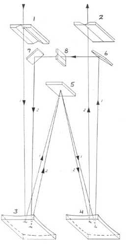 Double Pass 光路結(jié)構(gòu): 1.入射狹縫;2. 出射狹縫; 3. 準(zhǔn)直反射鏡; 4. 聚焦反射鏡; 5. 光柵; 6. Double Pass反射鏡; 7. Double Pass 反射鏡; 8.中央孔徑狹縫