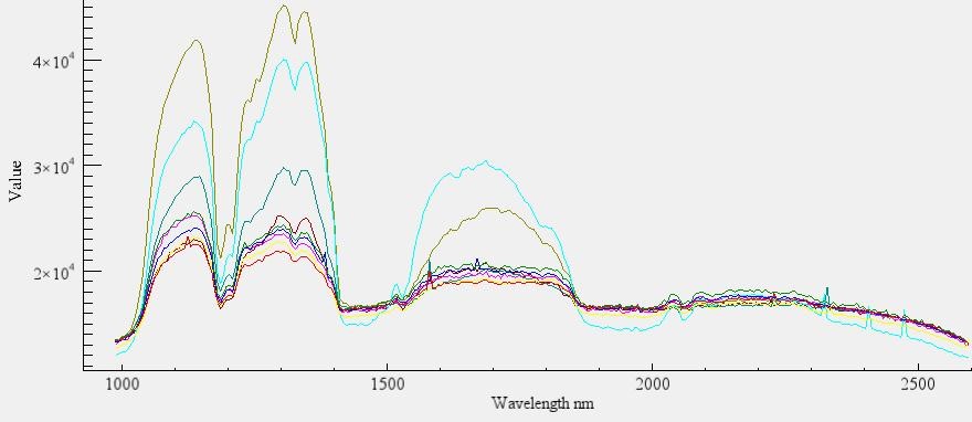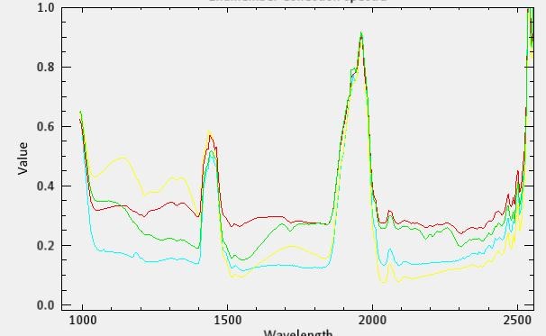 選取不同的目標(biāo)對(duì)象,獲取相應(yīng)的光譜,植被的光譜在680nm以后分反射率會(huì)提高,而非植被所表現(xiàn)出來(lái)的紅邊效應(yīng)與真實(shí)的植被的紅邊效應(yīng)有很大的差別。