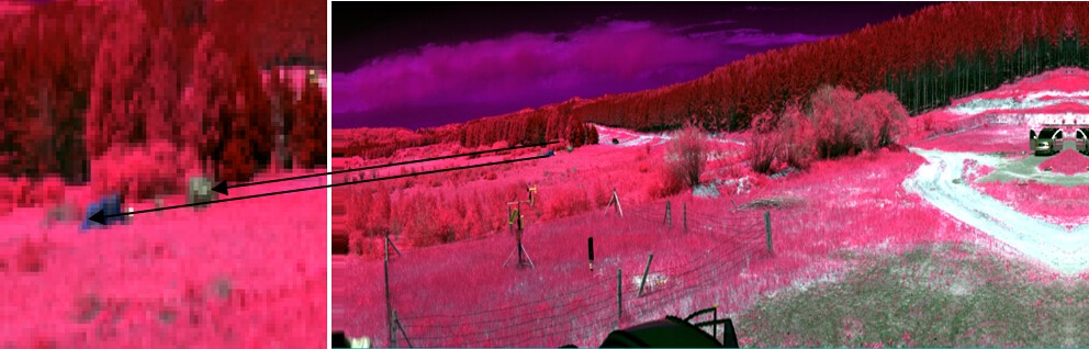 利用短波紅外相機(jī)對(duì)目標(biāo)進(jìn)行拍攝,獲取到相應(yīng)的偽裝目標(biāo)圖像,如下圖所示,光譜范圍為1000nm-2500nm波段。紅圈標(biāo)注目標(biāo)為偽裝網(wǎng)。利用短波紅外波段的相機(jī)可以很直接的獲取到偽裝目標(biāo)的影像并與其它背景目標(biāo)區(qū)分開(kāi)。