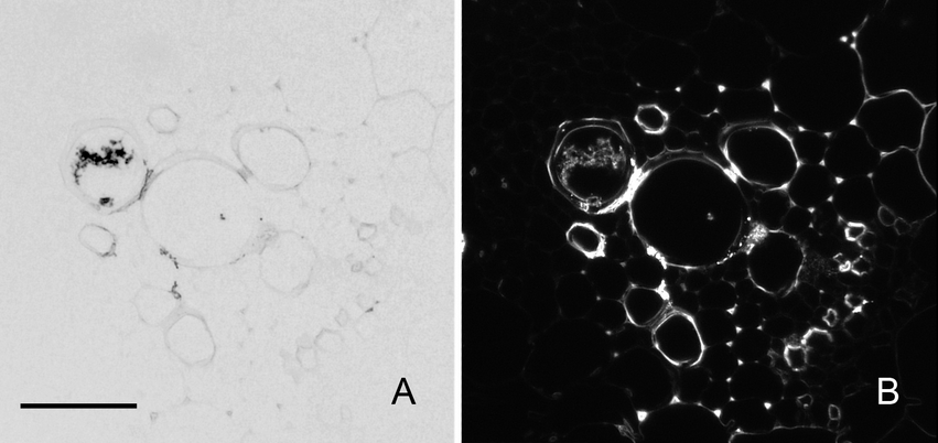 圖1 同一樣品明場(A)、暗場(B)像對比