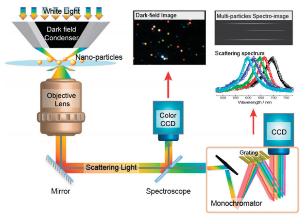 位于襯底、溶液、膠體或細(xì)胞中的金屬納米顆粒/團(tuán)簇是典型的均一樣品中的小尺度結(jié)構(gòu),因此暗場顯微技術(shù)是一種非常有效的觀測手段。更為有趣也更為重要的特性是,因?yàn)榧{米顆粒的介觀特征、表面活性,它們對電磁波的響應(yīng)既不同于單獨(dú)的原子/分子,也不同于長程有序的晶體。因此除了暗場散射成像以外,進(jìn)一步研究此類粒子散射光的光譜特征,有助于理解納米顆粒的尺度,狀態(tài),動力學(xué)過程,以及與周邊環(huán)境的相互作用信息。暗場散射光譜廣泛用于金屬納米顆粒研究,表面納米結(jié)構(gòu)研究,納米管及納米線,以及Plasmon Ruler等。
