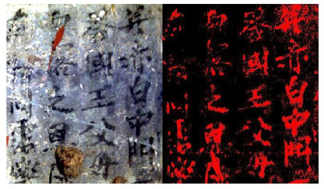 In the natural world, there are many phenomena of homogeneous and heterogeneous spectra, and the traditional non-imaging hyperspectral techniques are difficult to distinguish the objects from each other. However, with the development of remote sensing technology, the feature of "map-spectrum integration" of imaging hyperspectral provides technical support to solve the problem of homogeneous and heterogeneous spectra. However, based on the characteristics of imaging hyperspectral , the handwriting in the image can be better extracted from the background by using the Mahalanobis Distance method, as showed in Figure 5.