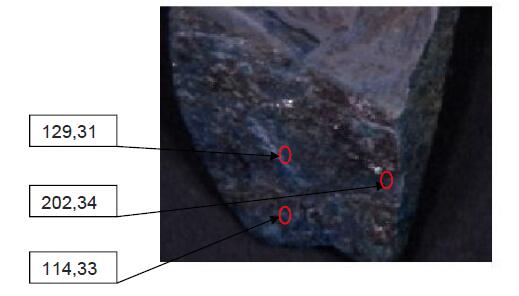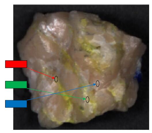 The samples were subjected to an imager in the 400-1000nm band. Spectral characteristic spectral information of mineral rocks in the 400nm-1000nm band was very limited. The spectral characteristics of this band were utilized to classify and identify them, and the results were not ideal. Figure 3 shows one of the samples to be checked, and three regions of interest are selected as the research objects. Figure 4 displays the characteristic spectral curve corresponding to the region of interest in Figure 3. Its characteristic spectral curve is very limited.