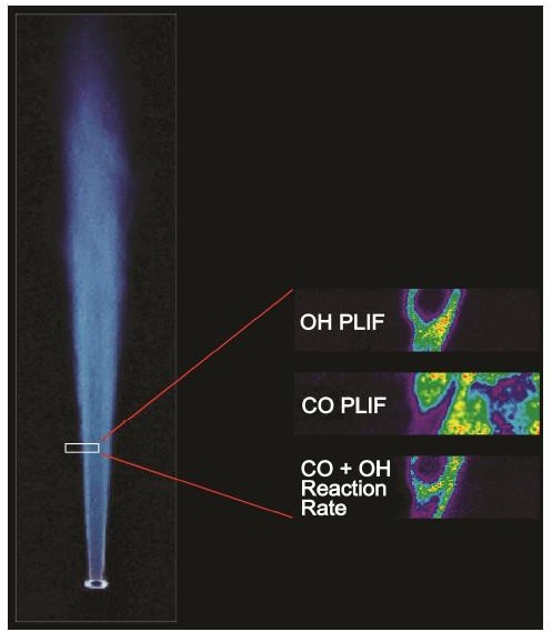 During the combustion process, insufficient combustion will produce many intermediate products. We can also use the laser to excite these intermediate products in the flame to obtain fluorescence for analysis, that is, laser- induced fluorescence (LIF). If the laser is shaped through optical components such as cylindrical mirrors into a thin parallel plane of light, which we call planar laser-induced fluorescence (PLIF)