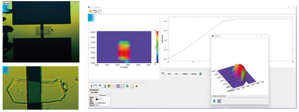 The system contains excitation lasers, scanning galvanometer, microscopy, data acquisition unit, and control software. When scanning the sample, the galvanometer make the laser spot scans and moves in the XY direction of the sample fast. The software records the position of each scanning point and current output value, and synchronously depicts a graph showing the current distribution of the sample. The light path also ensure the light spot pattern on different positions of the sample will not change.