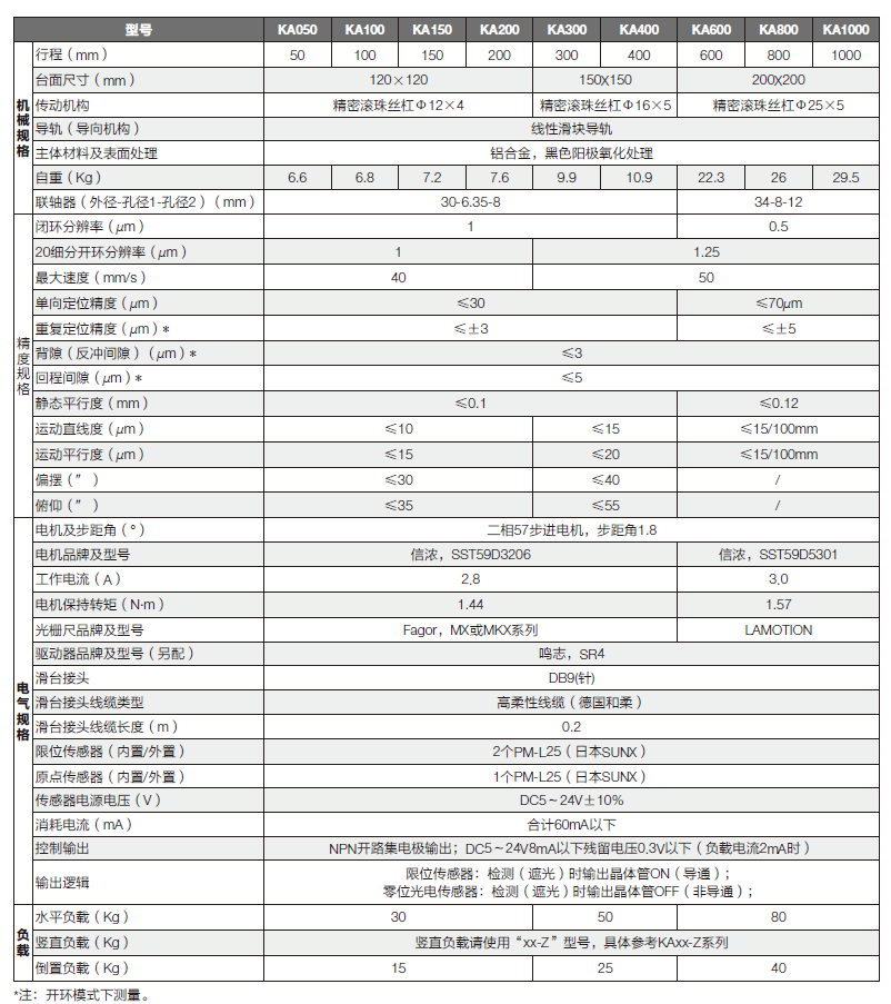 KA 系列產(chǎn)品采用精密級(jí)滾珠絲杠,配合線性滑塊導(dǎo)軌、高品質(zhì)聯(lián)軸器等部件,確保產(chǎn)品適用于復(fù)雜環(huán)境的高精度應(yīng)用領(lǐng)域,該系列產(chǎn)品采用外置進(jìn)口光柵尺,配合卓立漢光MC600 或TMC-USB 系列控制器,閉環(huán)分辨率為1μm/0.5μm,該系列產(chǎn)品其他關(guān)鍵技術(shù)指標(biāo)也達(dá)到國(guó)際水平。