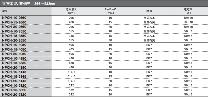日本SIGMA KOKI紫外激光分束立方體選型表