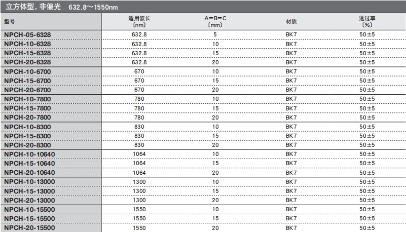 | OBCL20-632.8-R5 | 632.8nm分束立方體 | λ/4 | R=50%,T=50% | 20 |