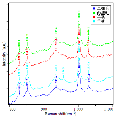 935 cm-1波數(shù)處的拉曼特征峰屬于 螺旋構(gòu)象的C-C骨架伸展振動(dòng),這一峰值表示變異山羊絨纖維的 螺旋含量的多少。從表中數(shù)據(jù)可以看出,毛纖維的 螺旋構(gòu)象的C-C骨架含量要明顯由于絨纖維。C-C骨架振動(dòng)區(qū)出現(xiàn)在890-960 cm-1區(qū),主要是骨架的拉伸振動(dòng),表征變異山羊絨纖維的拉伸性能,通過(guò)該特征峰可以為羊毛、羊絨纖維的拉伸、防粘縮等工藝提供指導(dǎo)意見(jiàn)。