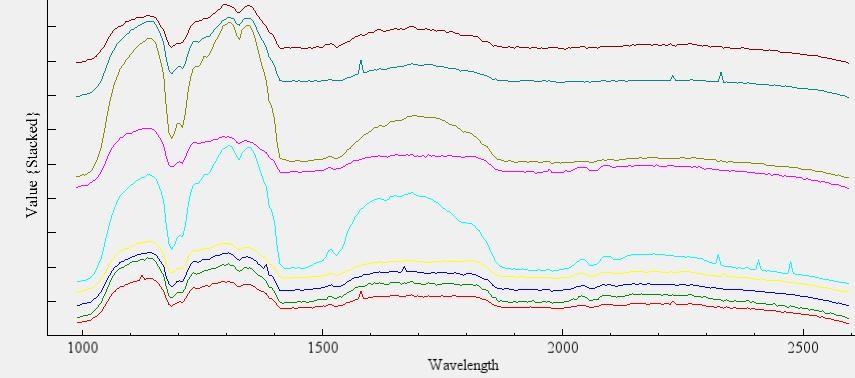 選取不同的目標對象,獲取相應(yīng)的光譜,植被的光譜在680nm以后分反射率會提高,而非植被所表現(xiàn)出來的紅邊效應(yīng)與真實的植被的紅邊效應(yīng)有很大的差別。