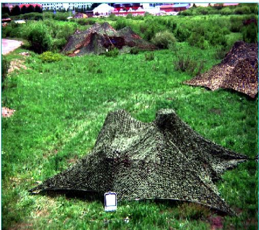 利用短波紅外相機對目標進行拍攝,獲取到相應(yīng)的偽裝目標圖像,如下圖所示,光譜范圍為1000nm-2500nm波段。紅圈標注目標為偽裝網(wǎng)。利用短波紅外波段的相機可以很直接的獲取到偽裝目標的影像并與其它背景目標區(qū)分開。
