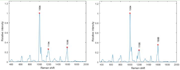 (1)圖4為PS:PLA=1:9混合樣品,利用手持式拉曼和實(shí)驗(yàn)室科研拉曼進(jìn)行對比,匹配度為0.93599。