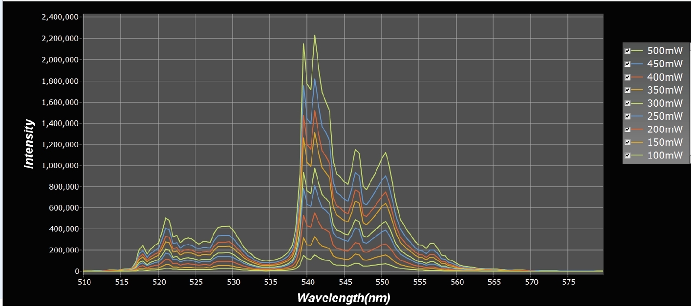 圖2. NaYF4:YbEr的變功率上轉(zhuǎn)換光譜測(cè)試