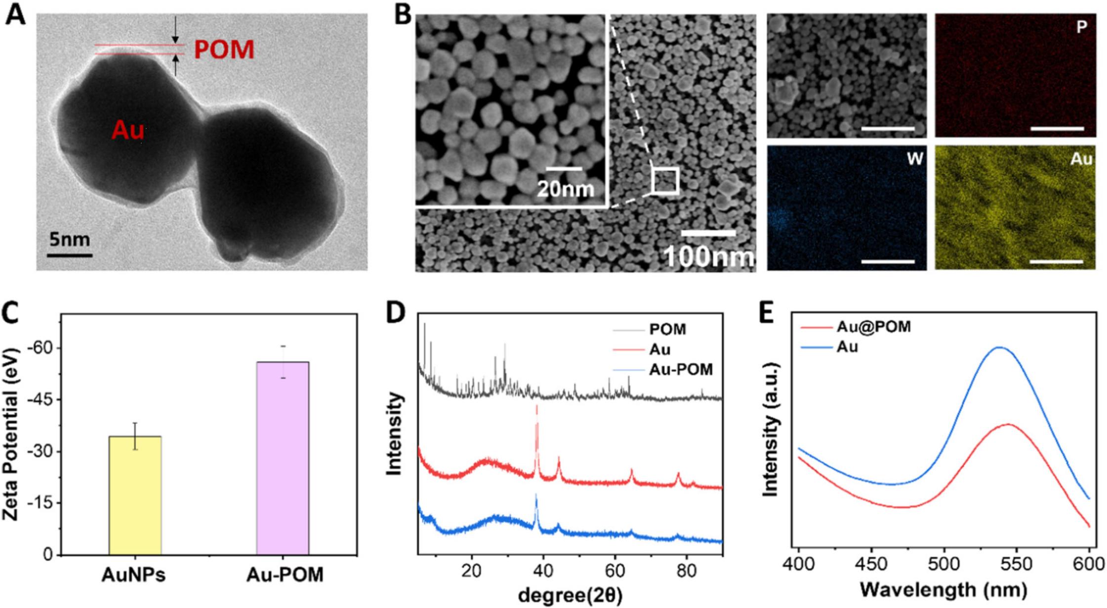 圖2 (A) Au@POM 納米顆粒TEM圖像,顆粒直徑15nm,Au核的POM薄層厚約1nm;(B)SEM圖和EDS圖譜;(C)納米顆粒ζ電位圖;(D)不同材料XRD圖;(E)Au與Au@POM的可見光吸收譜,介電常數(shù)改變導(dǎo)致Au@POM紅移