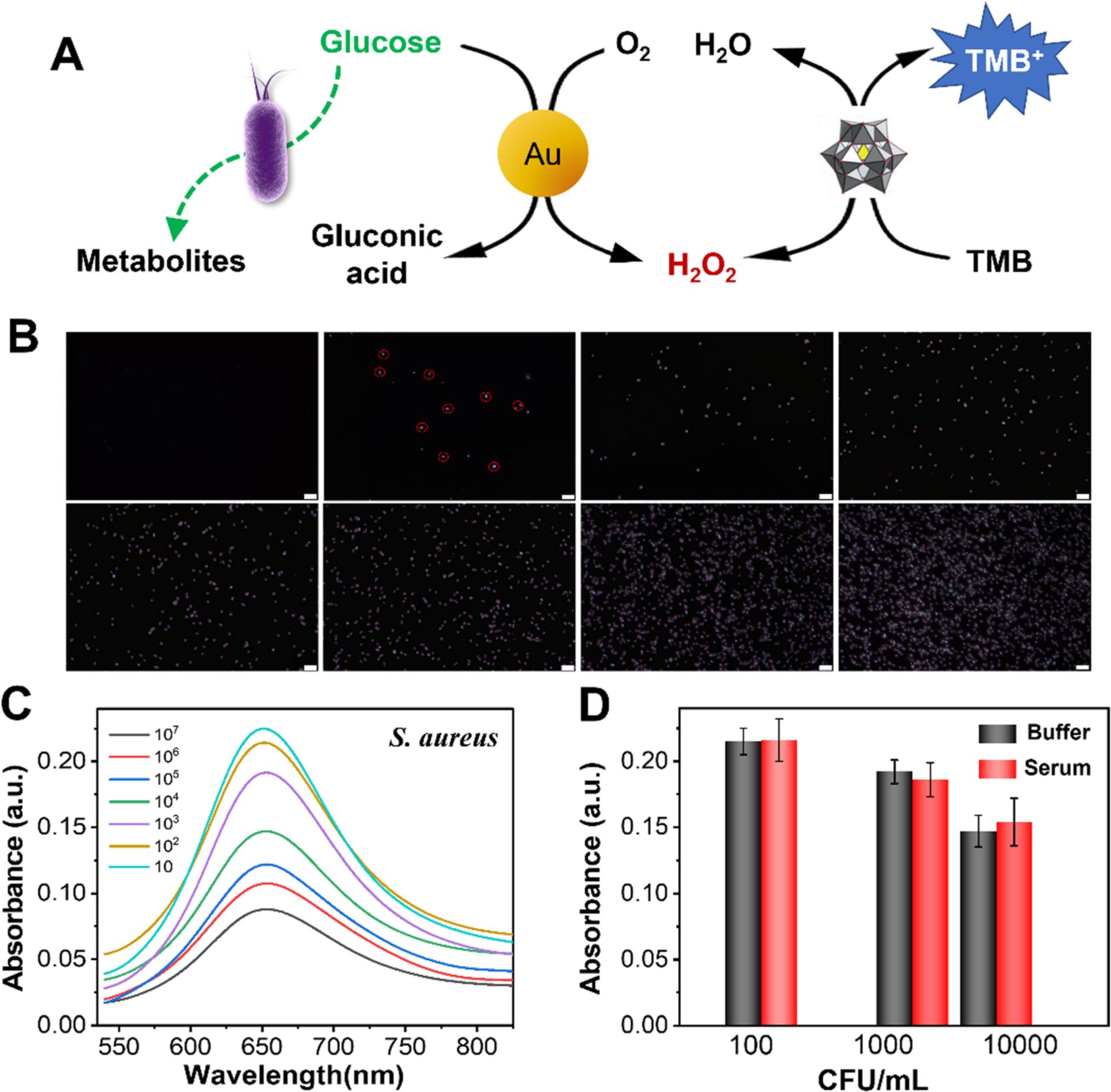 圖4 (A)納米酶級聯(lián)反應(yīng)細(xì)菌檢測原理示意圖;(B)不同尺寸金黃色葡萄球菌的暗場視野圖像(0,10,102-107 CFU·mL-1);(C)加入不同含量細(xì)菌后的可見光吸收光譜圖;(D)人體血清樣品和PBS緩沖液的細(xì)菌檢測