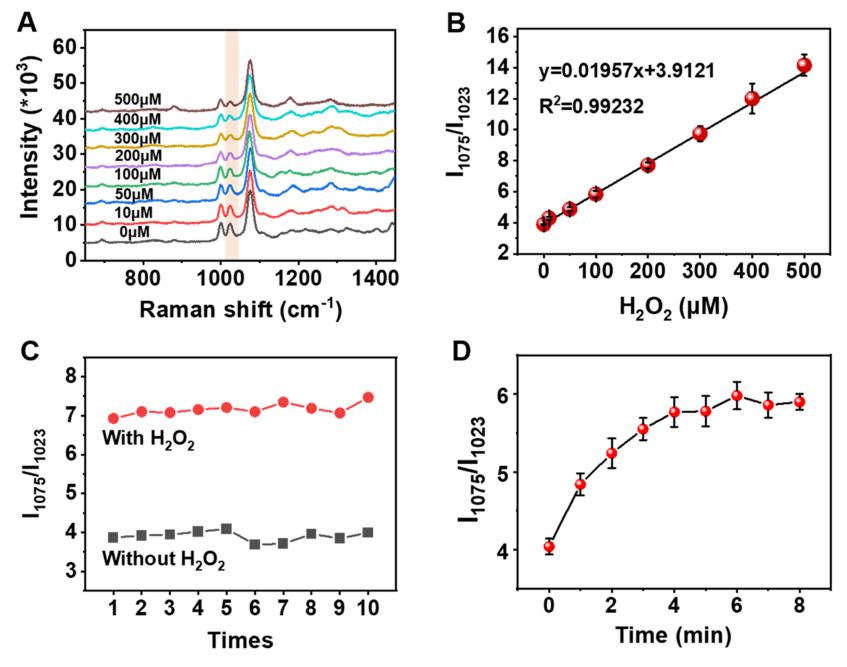圖3 (A) 不同H2O2濃度下, B-O-H變形振動(dòng)的1023 cm−1拉曼峰;(B)I1075/I1023拉曼峰強(qiáng)度比與H2O2濃度函數(shù)關(guān)系(C)I1075/I1023拉曼峰強(qiáng)度比率與時(shí)間變化關(guān)系,Au@COF為0.5nM