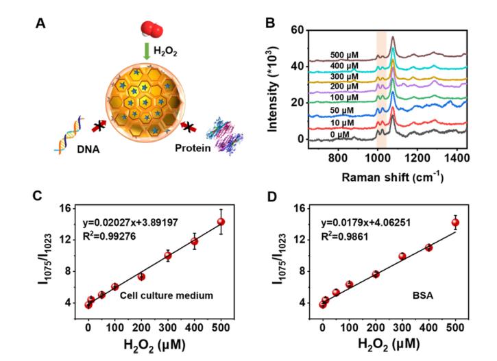 圖4(A) COF外殼保護(hù)作用示意圖,COF外殼阻擋大分子進(jìn)入;(B)細(xì)胞培養(yǎng)基中不同H2O2濃度下Au@COF/MPBA的拉曼光譜圖;(C-D)細(xì)胞培養(yǎng)基和BSA溶液中,I1075/I1023拉曼峰強(qiáng)度比與H2O2濃度函數(shù)關(guān)系,Au@COF為0.5nM。
