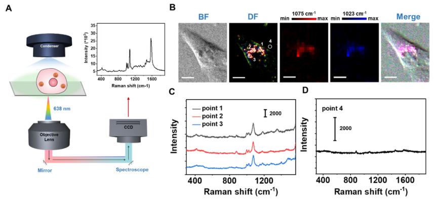 圖5 Au@COF/MPBA納米傳感器用于細(xì)胞內(nèi)成像;(A)共焦顯微鏡檢測(cè)光路示意圖;(B) MCF-7細(xì)胞在Au@COF/MPBA孵育后的明場(chǎng)、暗場(chǎng)圖像;(C-D)不同采樣點(diǎn)的拉曼光譜圖,1-3采樣點(diǎn)在1023和1075cm-1有拉曼峰,Au@COF濃度為0.25nM。