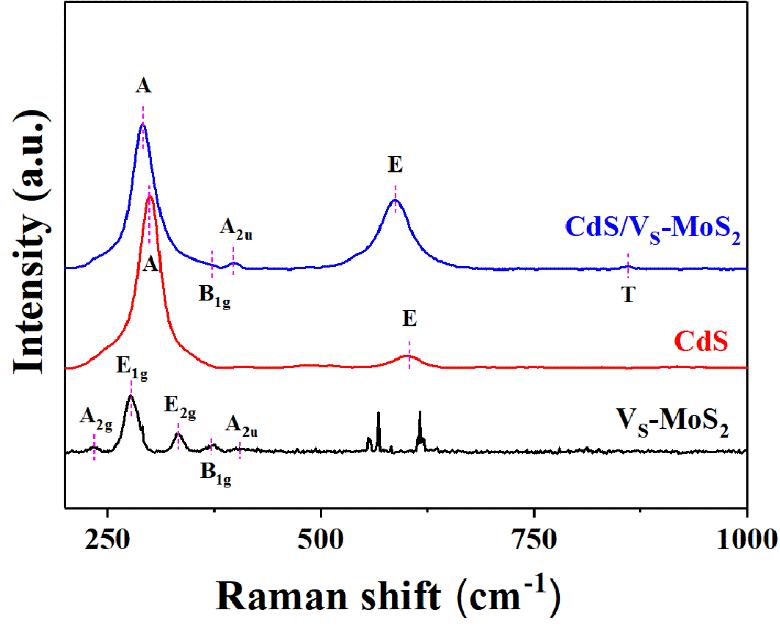 通過(guò)拉曼光譜圖(卓立漢光自主研制的Finder 930全自動(dòng)化拉曼光譜分析系統(tǒng)檢測(cè))可知, CdS 在300cm-1、601 cm-1和900 cm-1處的拉曼峰歸屬于A、 E 和 T 振動(dòng)模式。VS-MoS2在234 cm-1,278 cm-1,334 cm-1,373 cm-1和404 cm-1的拉曼峰歸屬于 D6h 點(diǎn)群的 A2g, E1g, E2g, B1g, 和A2u 振動(dòng)模式。此外,由于 CdS 與 VS-MoS2的相互作用,CdS/ VS-MoS2拉曼峰發(fā)生藍(lán)移現(xiàn)象。