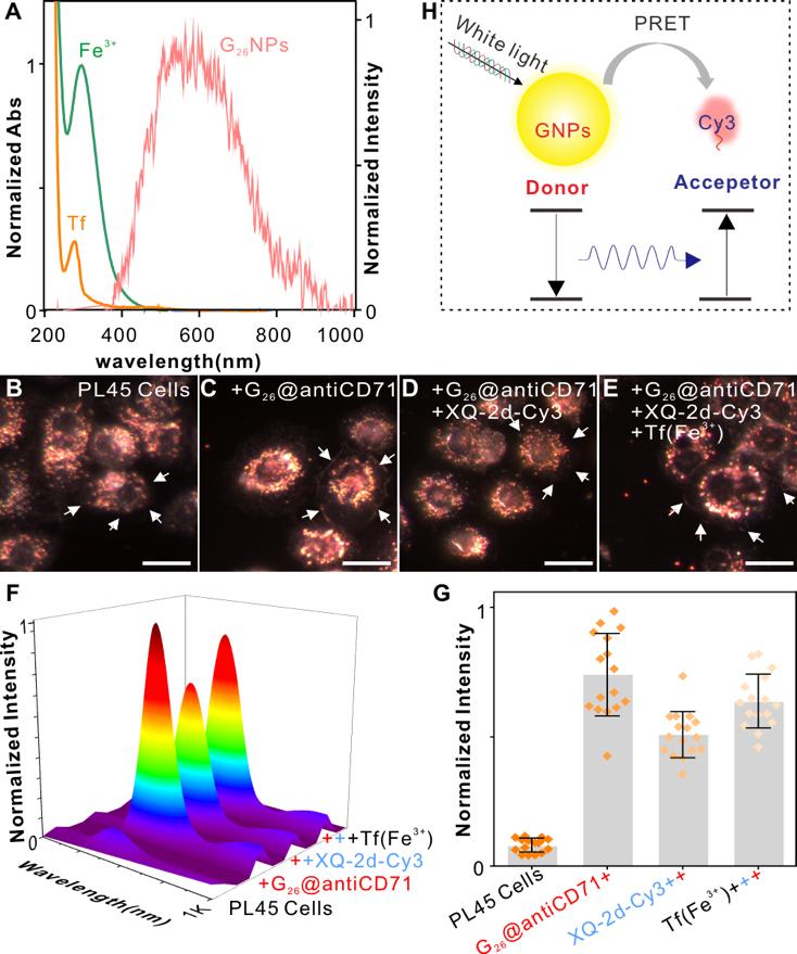 轉鐵蛋白Tf與適體XQ-2d-Cy3之間的競爭性結合,抑制了適體的結合,使得活細胞膜表面降低的金顆粒散射信號有所恢復,進一步驗證了PRET能量轉移過程的發(fā)生,展現了該PRET納米尺測量分子分離距離、蛋白質互作、分子靶標識別等方面的可行性。
