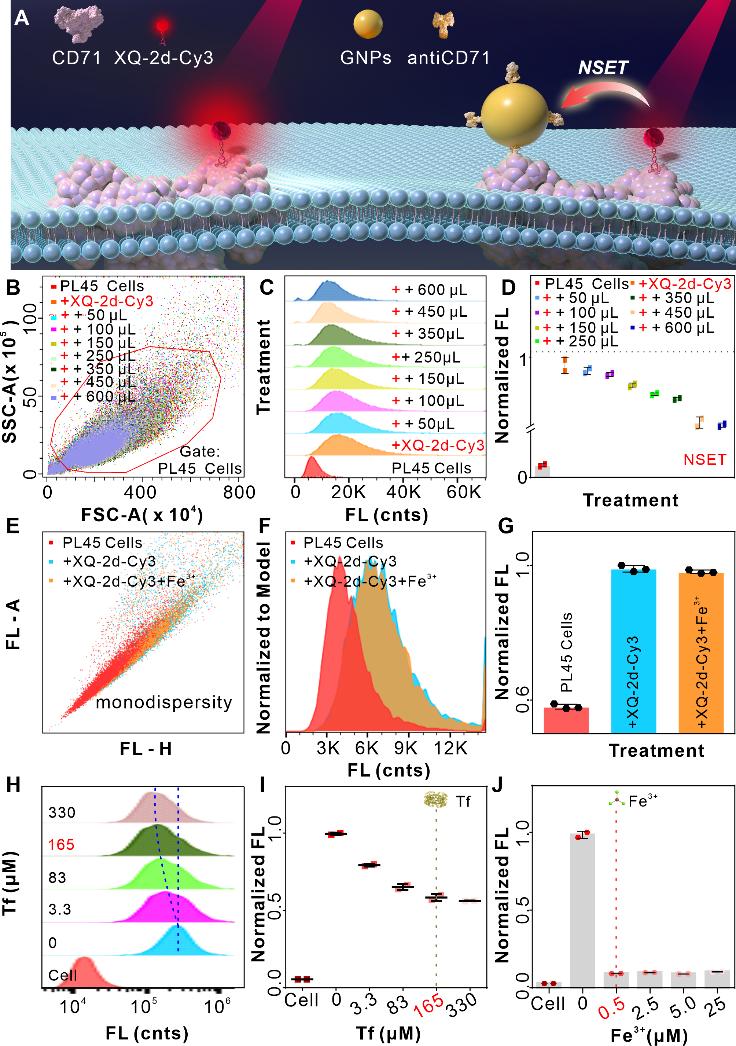 此外,研究團隊還利用流式細胞術在活細胞膜表面觀察了同一系統(tǒng)中 與PRET相反的能量轉移過程——NSET現象。即單獨激發(fā)熒光標簽(XQ-2d-Cy3)時,可以反向觀察到XQ-2d-Cy3到金顆粒表面的能量轉移過程。