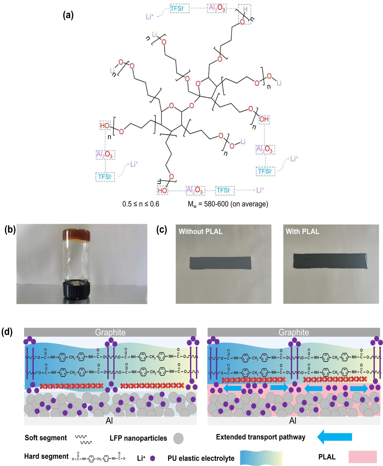 圖. PLAL的分子結(jié)構(gòu)。(a) PLAL ISC制備工藝原理圖及Al2O3在體系中的作用;(b)制備的PLAL ISC在室溫(25 ℃)下的照片;(c)商用LFP正極不帶/帶PLAL ISC;(d)添加PLAL ISC和不添加PLAL ISC時(shí)SPE與LFP接觸界面上Li+遷移路徑示意圖以及LFP|SPE|石墨電池的電池模型和內(nèi)部鋰離子遷移路徑示意圖。PLAL ISC顯著改善了離子躍遷動(dòng)力學(xué),并延長(zhǎng)了離子傳導(dǎo)通道。
