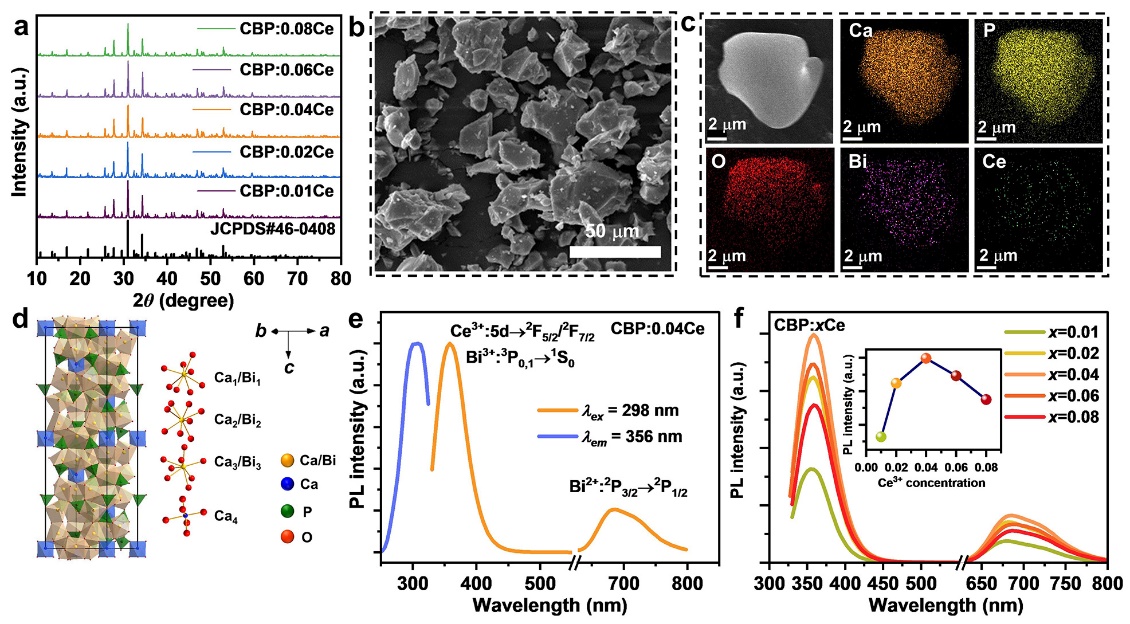 圖1 CBP:Ce粉體樣品的結(jié)構(gòu)、形貌及光致發(fā)光性能