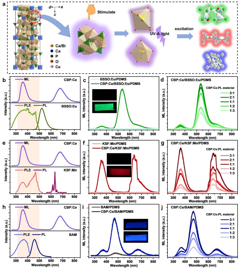 由于激發(fā)能級和機(jī)械刺激的不匹配性,部分光致發(fā)光材料在力學(xué)刺激作用下無法顯示力致發(fā)光。本工作中,當(dāng)一種光致發(fā)光材料復(fù)合到CBP:Ce/PDMS彈性體中,在力學(xué)刺激下,CBP:Ce/PDMS產(chǎn)生的近紫外光激發(fā)光致發(fā)光材料,從而顯示出各種顏色。由于近紫外光通常作為光致發(fā)光材料的激發(fā)光源,所以本策略具有普適性。圖3(b-j)進(jìn)一步演示了上述策略,顯然,這種基于近紫外力致發(fā)光激發(fā)的發(fā)光調(diào)控策略能夠賦予光致發(fā)光材料優(yōu)異的力致發(fā)光性能,極大地豐富了力致發(fā)光材料體系。