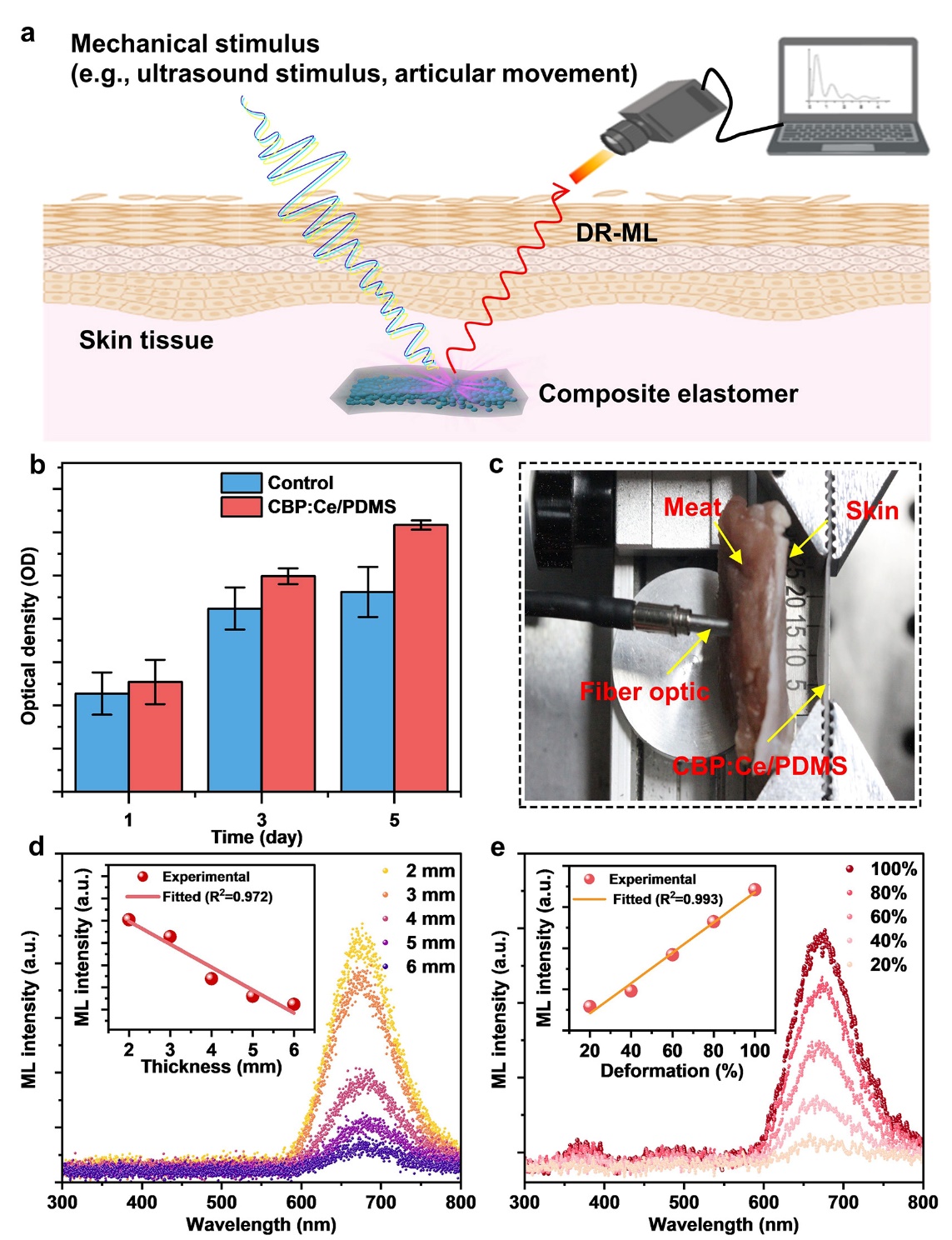 本工作選取豬皮和豬肉組織模擬生物皮膚組織,并在拉伸模式下記錄通過上述組織的力致發(fā)光信號,證明CBP:Ce/PDMS復(fù)合材料發(fā)射的深紅色力致發(fā)光具有很好的穿透性(圖5)。生物相容性實驗表明CBP:Ce/PDMS復(fù)合材料具有理想的生物相容性。深紅色力致發(fā)光的組織滲透和力學(xué)傳感能力方面的演示表明,CBP:Ce/PDMS在生物體原位生物力學(xué)檢測方面具有廣闊的應(yīng)用前景。