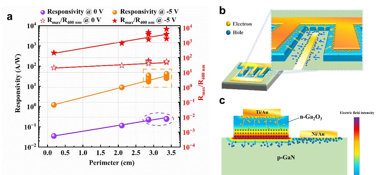 本工作通過在p-GaN/n-Ga2O3外延層上制備了具有指狀n-Ga2O3層和叉指電極的PN-PDs,證明了此結(jié)構(gòu)可顯著增強器件性能,并深入分析了此結(jié)構(gòu)的內(nèi)在增強機制。將叉指結(jié)構(gòu)應(yīng)用于p-GaN/n-Ga2O3異質(zhì)結(jié)UVCPDs,獲得了 2.76 μs (快速分量)和 31 μs(1/e 衰減)的超快瞬態(tài)特性、0.25 A W-1@0 V 和 41.6 A W-1 @-5 V 的高響應(yīng)度以及 8.2 × 103 的高 UVC 選擇比。叉指結(jié)構(gòu)的長電極周長和窄電極間距不僅提高了0 V時的載流子收集效率,而且增加了負(fù)偏置時的內(nèi)置電場,使得PD的性能得到顯著提高。同時研究團(tuán)隊發(fā)現(xiàn)在0 V自供電模式下,電極周長是決定靜態(tài)和瞬態(tài)特性的唯一因素,而負(fù)偏置下電極間距是另一個重要因素。這項工作不僅提出了一種高性能的PD,而且還研究了基于氧化鎵的PN-PD的關(guān)鍵參數(shù)的設(shè)計,為探索高性能的氧化鎵基PD提供了新思路。