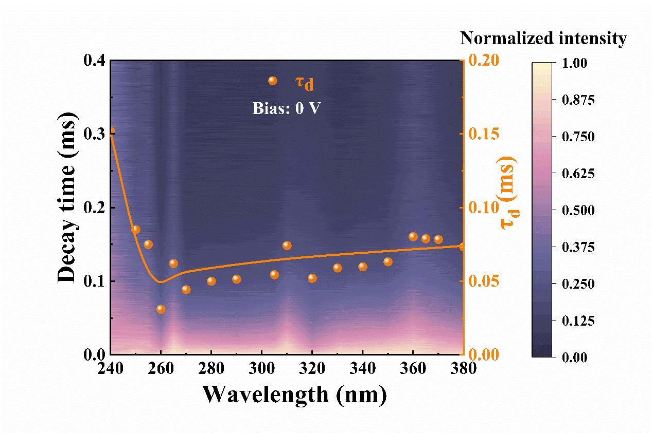 圖4顯示了PD1-3在不同激發(fā)波長下的響應(yīng)衰減過程。橙色線代表 PD1-3 的 1/e 衰減時間。在整個240 nm-380 nm波長范圍內(nèi),PD的響應(yīng)速度保持在數(shù)十微秒的量級,顯示出其超快的響應(yīng)特性。PD在260 nm光照射下表現(xiàn)出*快的響應(yīng)速度,對應(yīng)于Ga2O3的相干激發(fā)(吸收光譜為4.74 eV),消除了載流子弛豫時間。