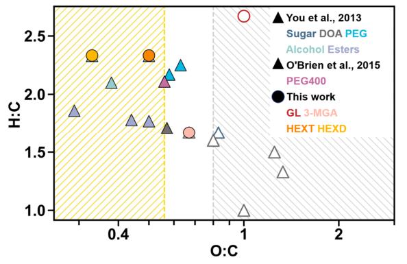 圖5. 混合有機(jī)/硫酸銨(AS)顆粒的Van Krevelen圖:實(shí)心符號(hào)表示觀察到了液-液相分離(LLPS),而空心符號(hào)表示未觀察到液-液相分離。實(shí)心三角形代表二元羧酸(DOA,包括丙二酸、蘋果酸、檸檬酸、戊二酸和二乙基丙二酸),糖類(如脫水葡萄糖),酯類(包括己二酸二乙酯、癸酸甲酯和聚丙烯酸酯),醇類(包括2,5-己二醇、丙二醇和1,2,6-己三醇),聚乙二醇(包括PEG200和PEG300)數(shù)據(jù)引自于You等人的工作(2013年),硫酸銨-聚乙二醇400的合成方法引自于O'Brien等人的工作(2015年)。